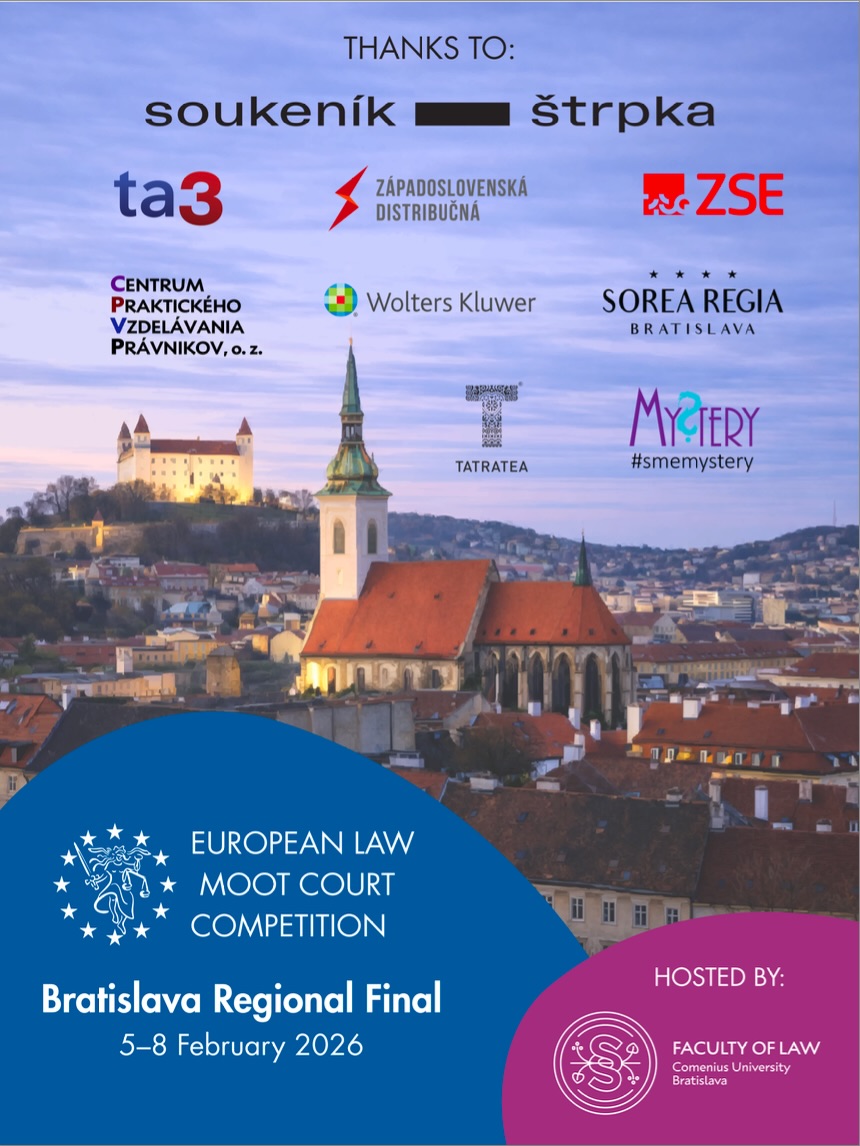 V dňoch 5. – 8. februára 2026 sa v priestoroch Právnickej fakulty Univerzity Komenského v Bratislave uskutočnilo Bratislava Regional Final prestížnej súťaže European Law Moot Court Competition (ELMC).